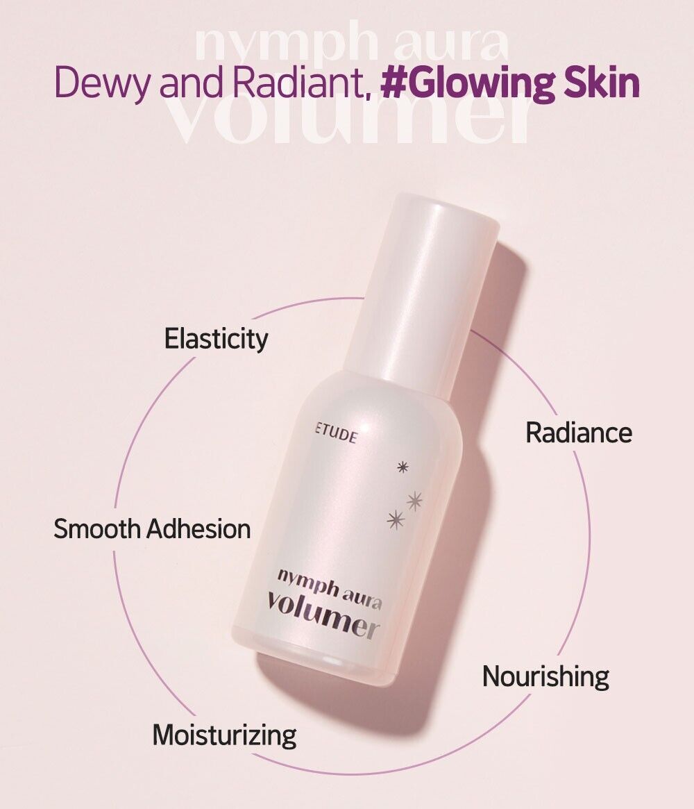Etude's nymph aura volumer is a versatile cream/primer that boosts skin’s moisture and glow, leaving a fresh, radiant finish. it can be worn on its own or blended with foundation for a naturally luminous and hydrated look.